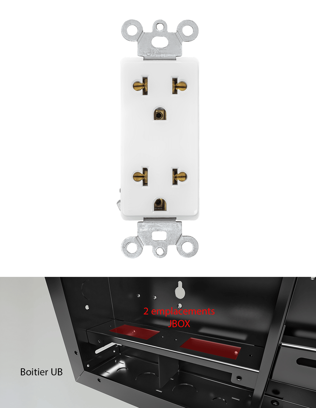 Boitier de raccordements comportant deux emplacements au format JBOX. Chaque boitier UB est livré avec un UB-JBA déjà en place, mais il est possible d'en rajouter un second au besoin.L'un des deux emplacements JBOX est munis d'une plaque (pouvant être retirée pour libérer la totalité de l'emplacement JBOX) avec quatre ports au format Keystone.