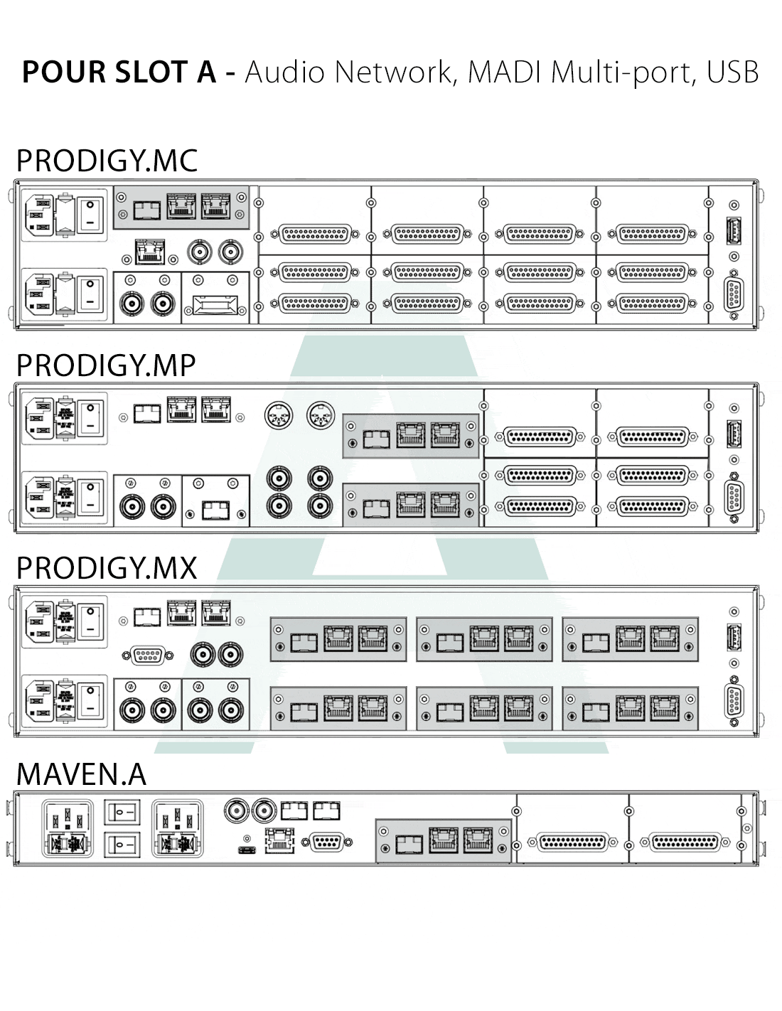 Avec ce seul module il est possible de gérer les flux des deux protocole audio. À noter : le PRODIGY.MP étant pourvu de 2 slots A, il sera donc possible de gérer jusqu'à 4 protocoles audio différents.