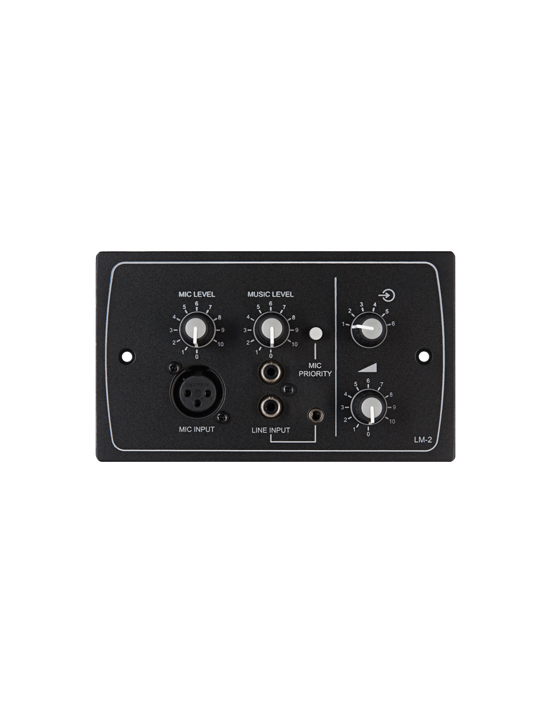 Le clavier mural LM-2 permet de connecter physiquement un microphone et/ou une source audio stéréo au sein d'une zone, de les mixer avec des réglages de niveau indépendants et de les acheminer vers l'amplificateur et les enceintes de la zone. La priorité microphone/musique est sélectionnable. Le LM-2 offre également les mêmes fonctionnalités de contrôle à distance que le Cloud RSL-6, avec la sélection de la source de musique d'ambiance et le réglage du niveau.