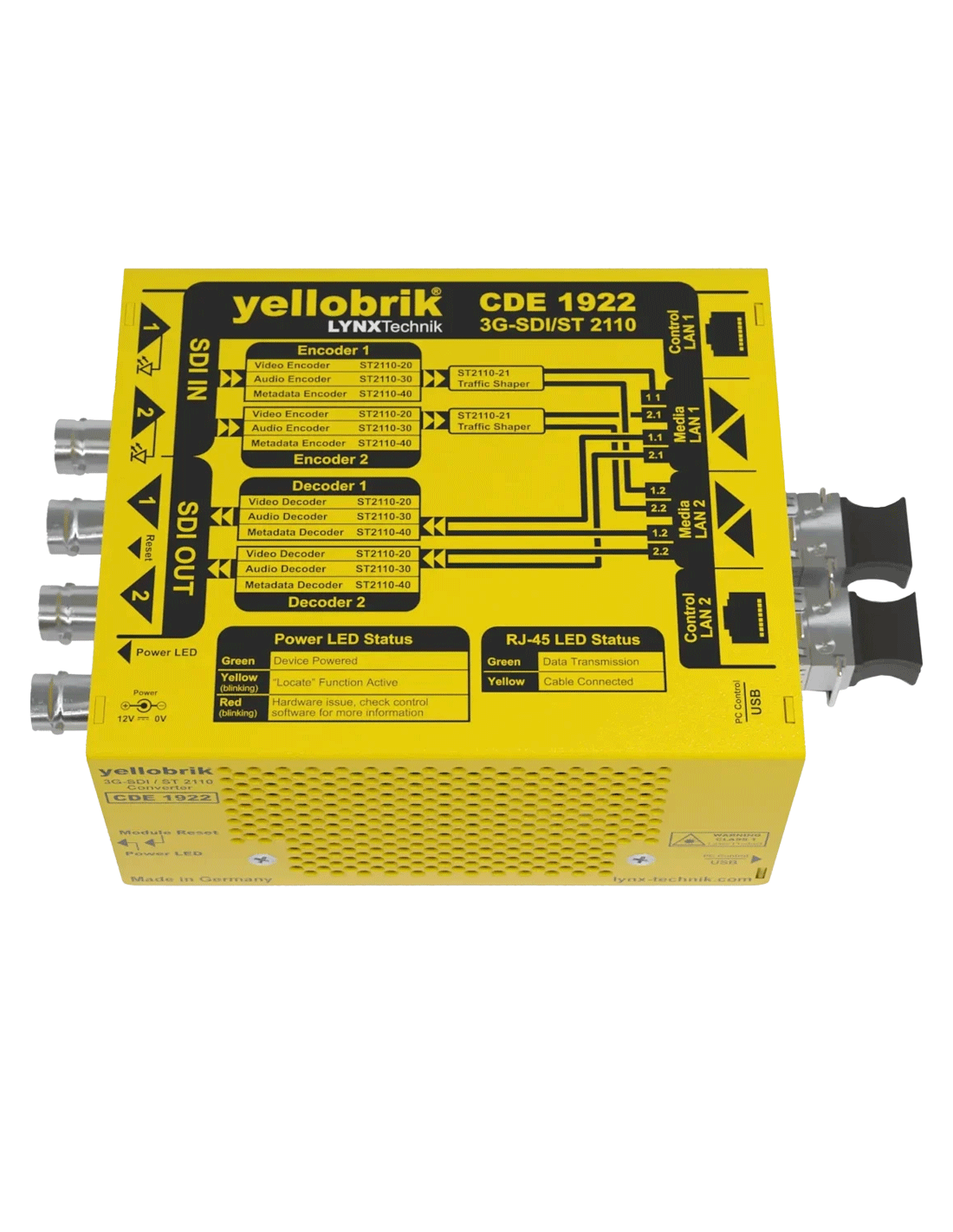 Ce module Yellobrik est compatible avec tous les signaux SMPTE standard, du 1,5 G-SDI au 3G-SDI (SMPTE 292M, 424M) et les connexions réseau de contrôle 10 GbE SMPTE 2110/1 GbE. Il fonctionne avec les données vidéo, audio et auxiliaires non compressées SMPTE ST 2110, et offre une redondance complète des liaisons grâce à la commutation de protection transparente ST 2022-7.