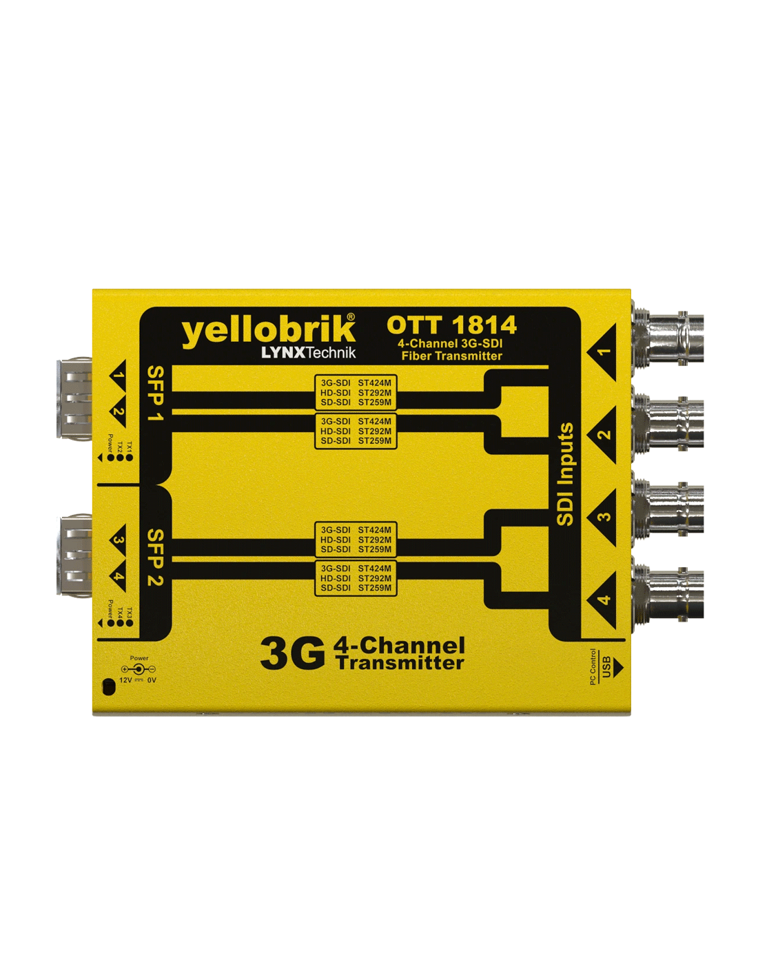 Associé au récepteur fibre optique SDI 4 canaux (yellobrik ORR-1804), il constitue un système émetteur/récepteur optique 4 canaux très économique pour les signaux allant jusqu'au 3G-SDI (2048 × 1080 @ 60Hz), tout en préservant une qualité non compressée.