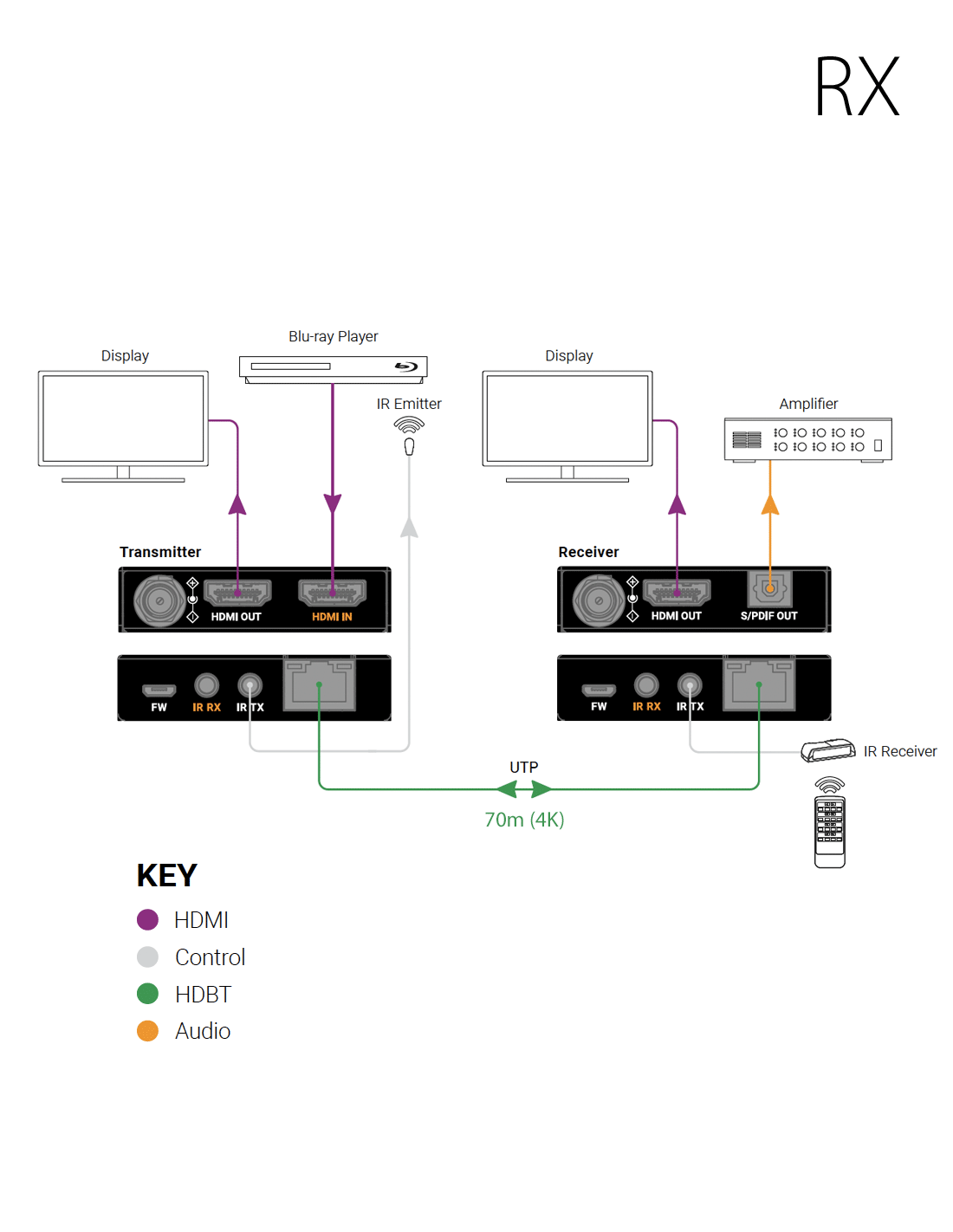 - L'unité RX comprend un interrupteur latéral pour choisir entre l'audio ARC (retournant l'audio du téléviseur) ou l'audio désembeddé (extraction de l'audio du signal source étendu).