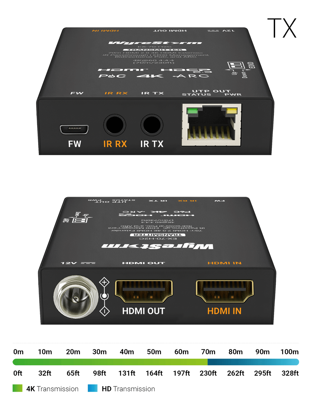 L'EX-70-H2C est une solution de distribution vidéo haute performance conçue pour les home cinémas résidentiels et les salles de conférence multimédias. L'extendeur est capable de transmettre des signaux 4K @ 60 Hz (4:4:4) et 18 Gbit/s jusqu'à 70 m via un seul câble Cat6/6a. Une sortie HDMI est présente sur l'émetteur pour un moniteur local. L'ensemble offre des fonctionnalités essentielles telles que la transmission infrarouge bidirectionnelle pour le contrôle à distance, l'alimentation bidirectionnelle par câble (PoC) et la prise en charge de ARC (Audio Return Channel) avec un port audio S/PDIF de désembeddage.