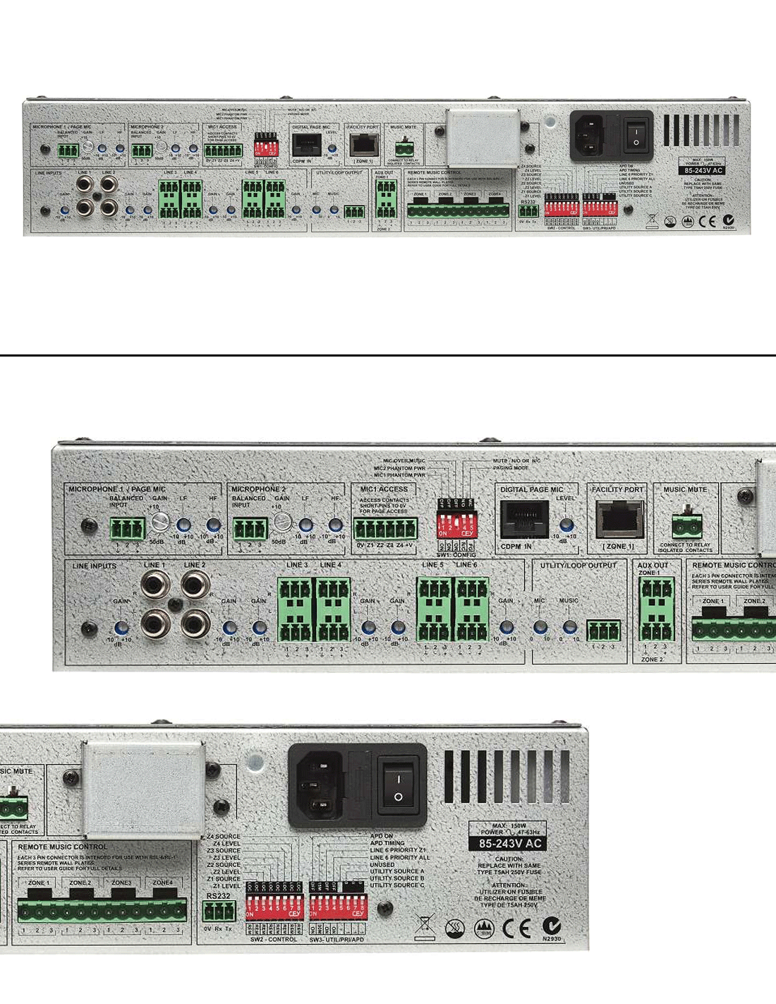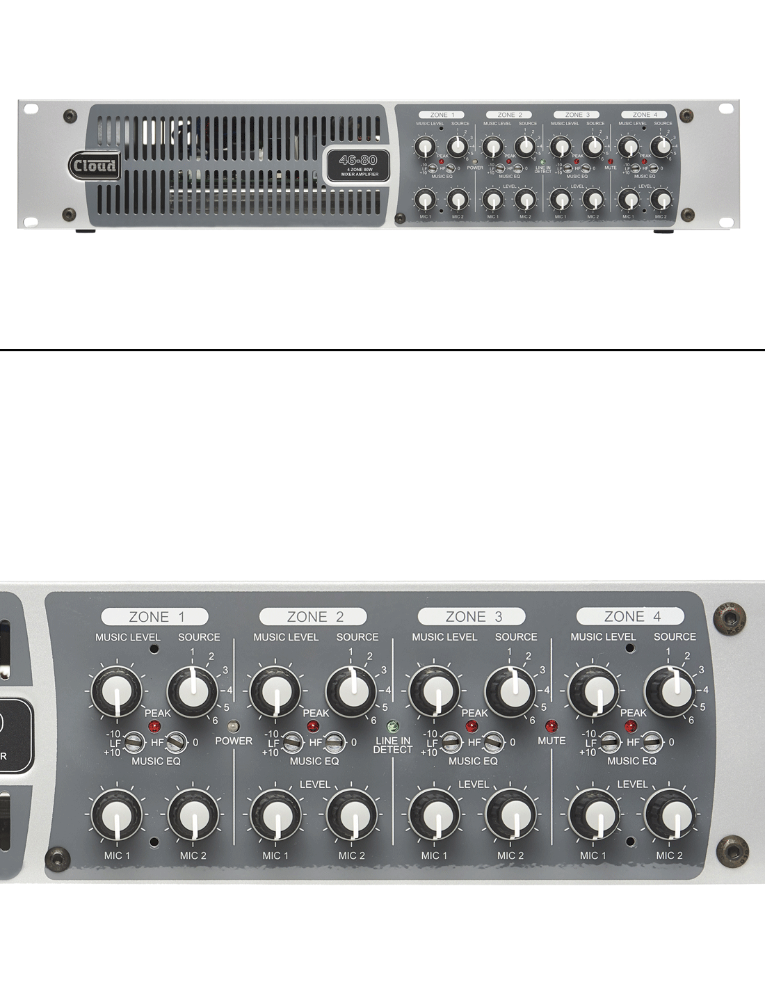 Le modèle 46-80 est équipé d'un port pour microphone de sonorisation numérique Cloud CDPM, ce qui le rend directement compatible avec les microphones de sonorisation de la série Cloud PM. L'entrée Mic 1 peut également être configurée pour s'adapter à la plupart des systèmes de sonorisation OEM. La sélection de zone pour la sonorisation s'effectue par des connexions d'accès à la masse. L'appareil peut être configuré par un cavalier interne pour une atténuation automatique du son (priorité au microphone sur la musique), déclenchée par la voix. L'entrée ligne 6 peut être configurée, via des commutateurs DIP sur le panneau arrière, pour avoir la priorité sur toute autre source musicale sélectionnée, soit dans la zone 1, soit dans toutes les zones. Ceci facilite la connexion d'un jukebox, d'un système de stockage audio numérique ou d'un appareil similaire. Une entrée du port Facility, provenant d'une plaque d'entrée distante, peut être configurée pour s'atténuer lorsqu'un signal est présent sur l'entrée Mic 1 ; cela permet de diffuser des annonces d'urgence même dans les zones utilisant des sources d'entrée connectées localement. Toutes les priorités permettent un retour en douceur à la source musicale d'origine.