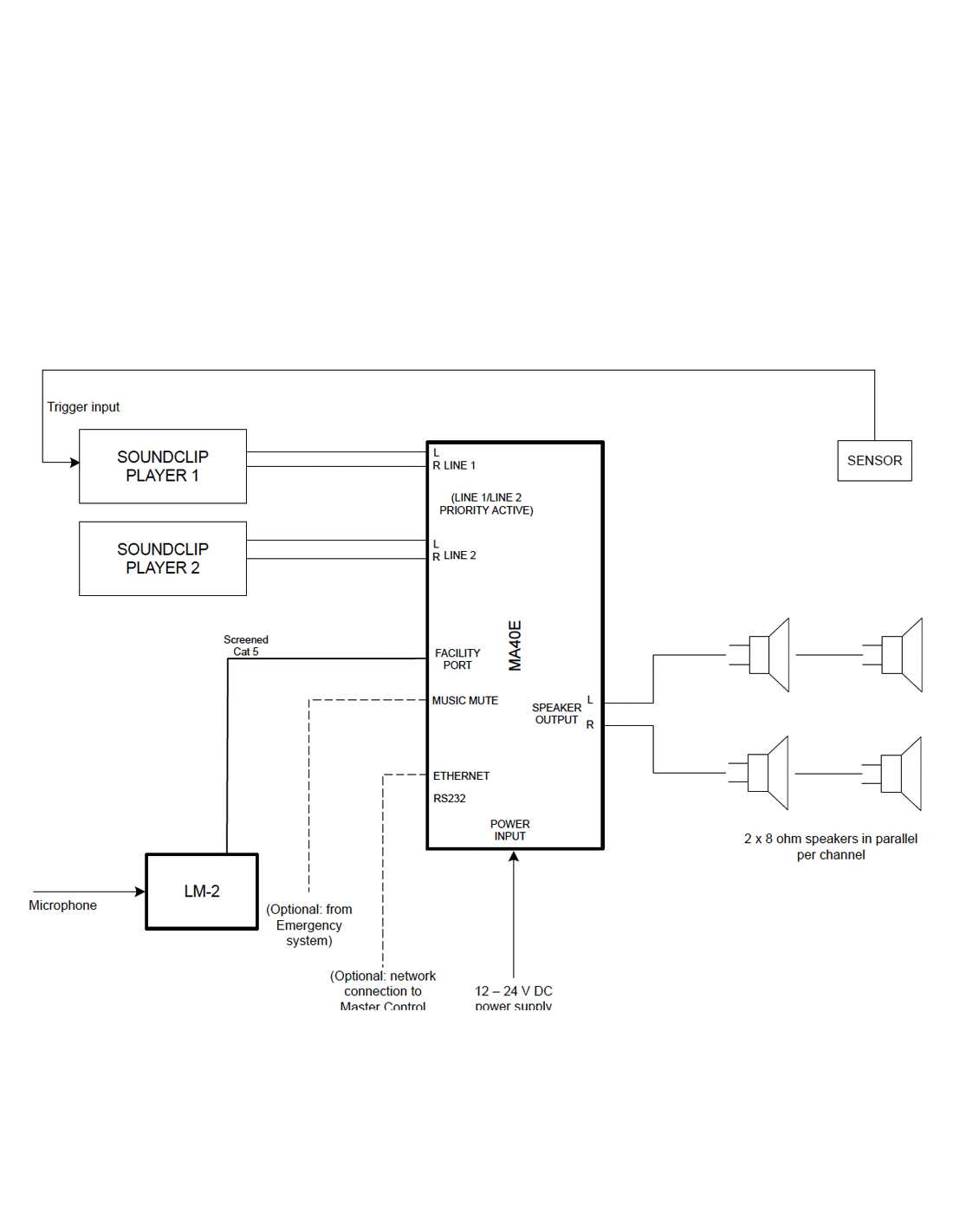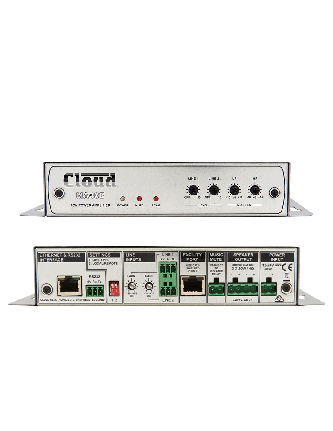 Le MA40E intègre une amplification stéréo de 2 x 20 W sous 4Ω (Lo-Z). Il est équipé d'interfaces Ethernet et RS232, de deux entrées ligne et d'une entrée Facility permettant la connexion de claviers muraux d'entrée active LM-2 et BT-1 (Bluetooth).