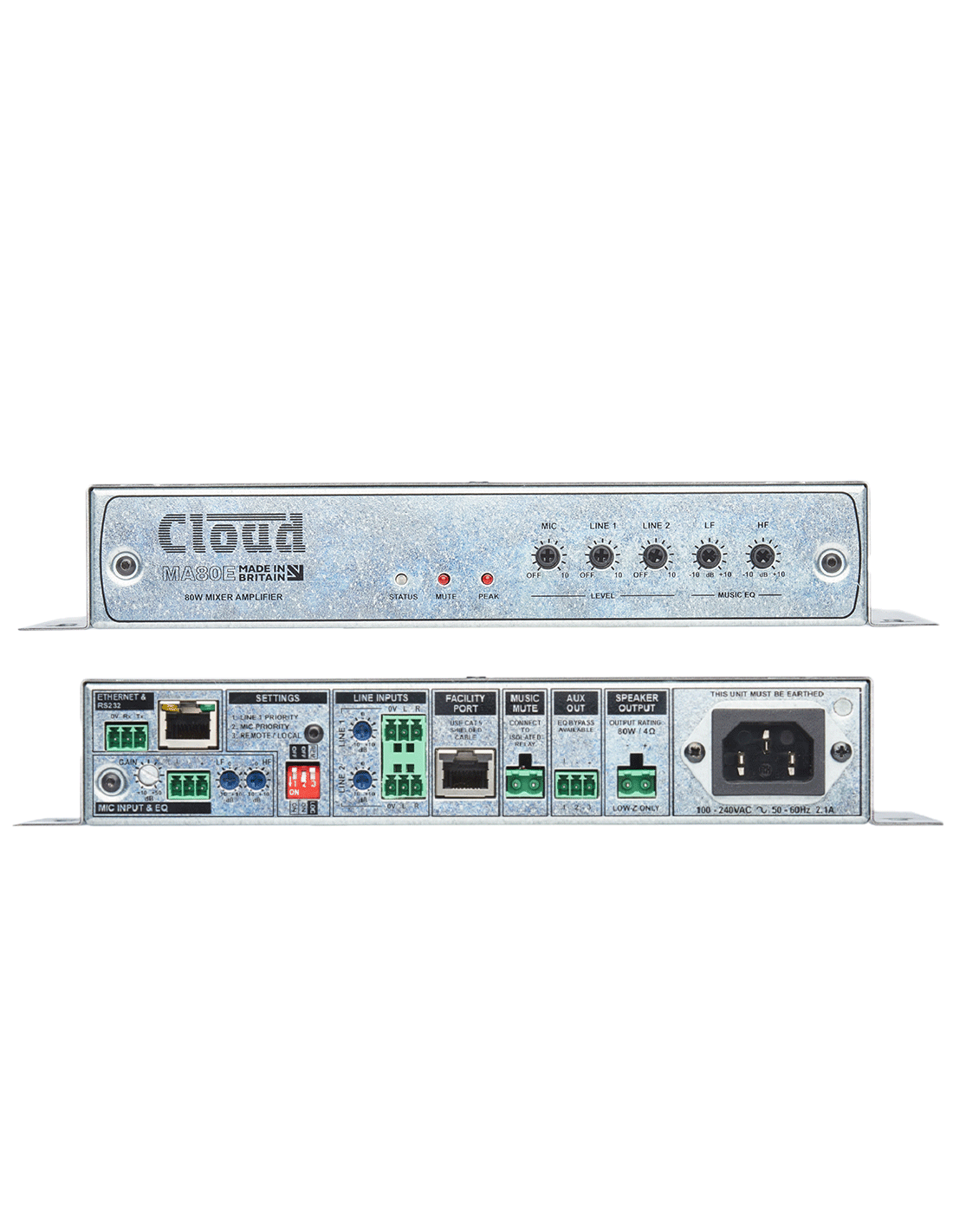 L'une des caractéristiques particulièrement utiles du MA80E est son port Facility, permettant de connecter un clavier mural distant Cloud LM-2 (pour les sources filaires) ou Cloud BT-1 (pour les sources sans fil Bluetooth) via un câble Cat 5 blindé. Microphones et/ou sources audio telles que micros sans fil, tables de mixage DJ, lecteurs MP3, ordinateurs portables ou autres sources audio – y compris les ordinateurs portables, tablettes et smartphones compatibles Bluetooth – peuvent alors être connectés localement, simplifiant ainsi l'utilisation de l'espace pour les présentations nécessitant l'utilisation de sources audio portables. Le port RJ45 est équipé d'un seuil de bruit fixe pour éliminer les bruits de fond en l'absence de signal d'entrée. Les claviers LM-2 permettent également le contrôle à distance du niveau sonore et la sélection LINE 1/LINE 2.