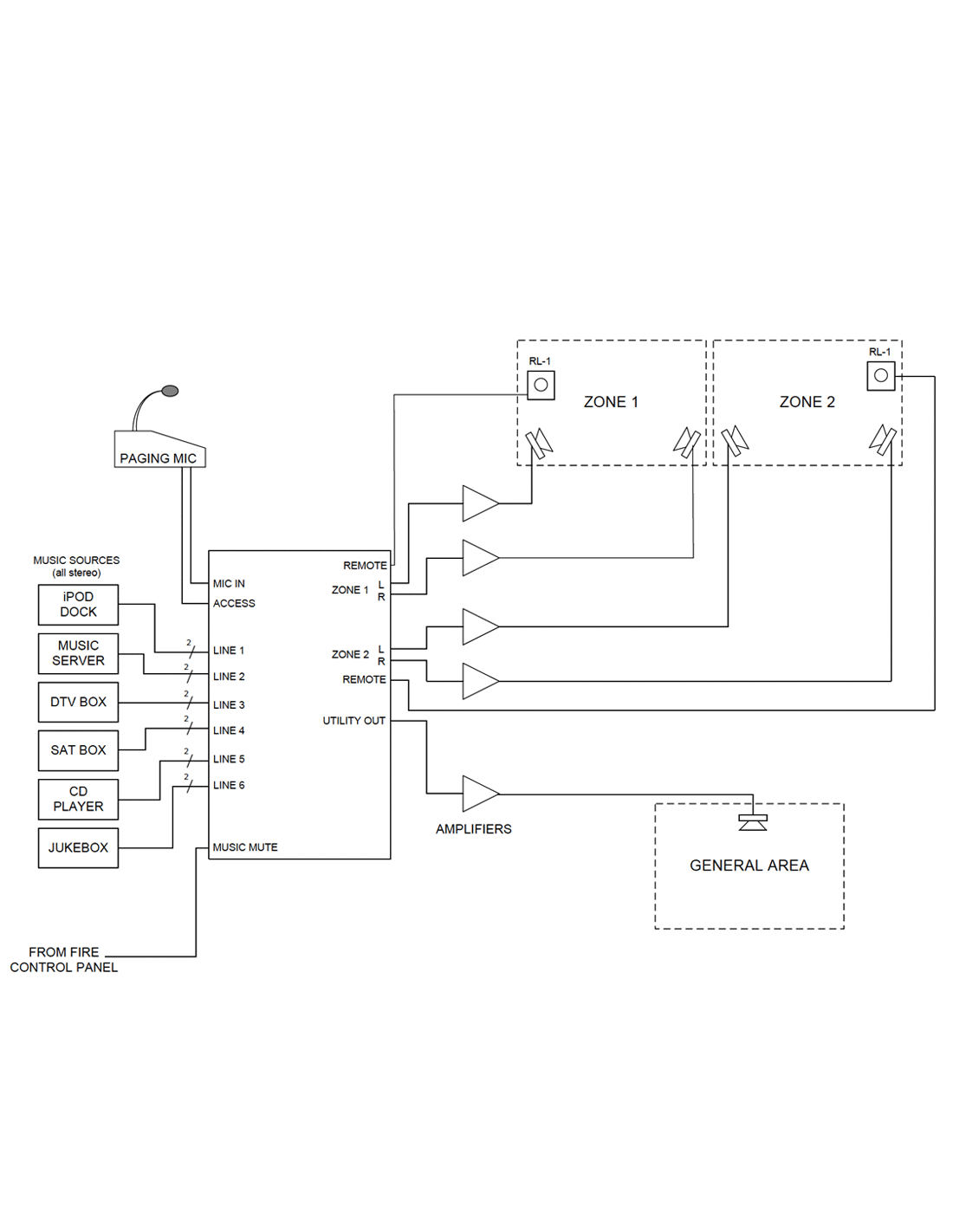 - 2 sorties zone stéréo symétriques (configurables en mono), avec réglage EQ