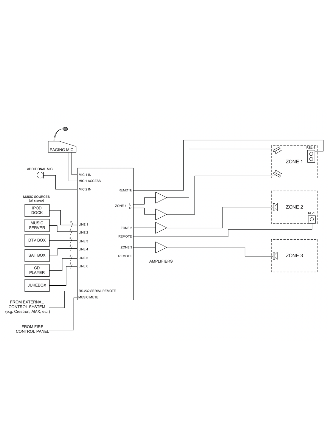 - 3 sorties zone (1 stéréo + 2 Mono), chacune avec réglage EQ