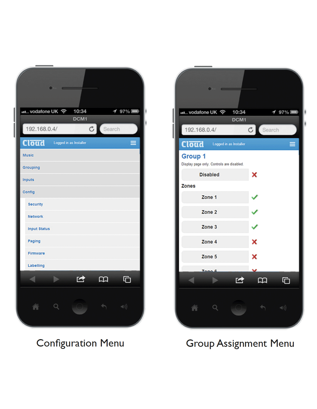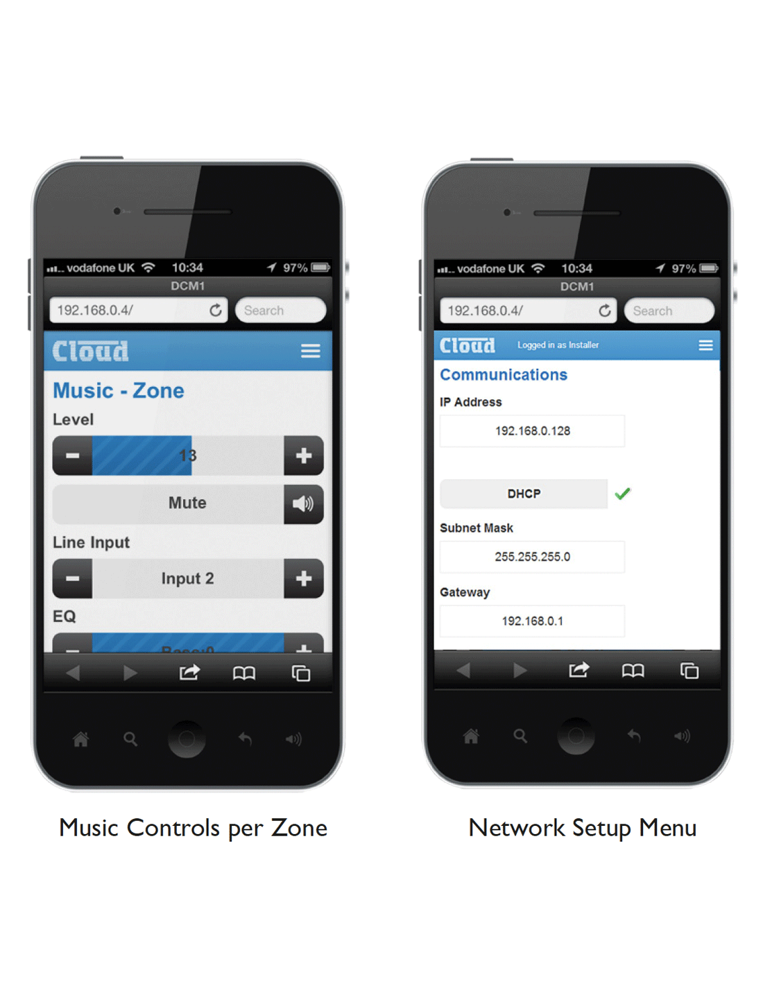 Le DCM1e intègre une interface Ethernet et un serveur web interne, permettant ainsi le contrôle depuis un smartphone, un ordinateur portable, une tablette ou un ordinateur via un navigateur web. Une fois configuré, l'appareil permet de combiner ou de séparer les zones en fonction des besoins.
