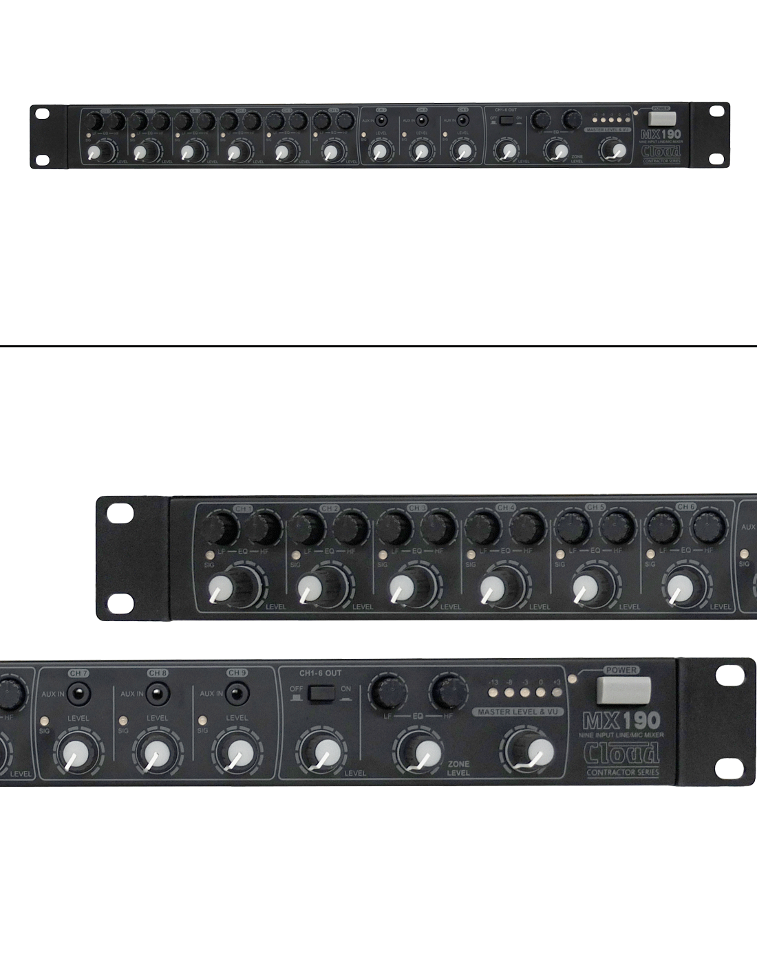 Le MX190 est un mélangeur doté de 6 entrées micro/ligne et de 3 entrées stéréo ligne. Toutes les entrées disposent d'un EQ et d'un contrôle de gain. Sortie stéréo symétrique sur deux connecteurs XLR3M, et il existe des sorties supplémentaires Zone, Record et Input 1-6 Sum.