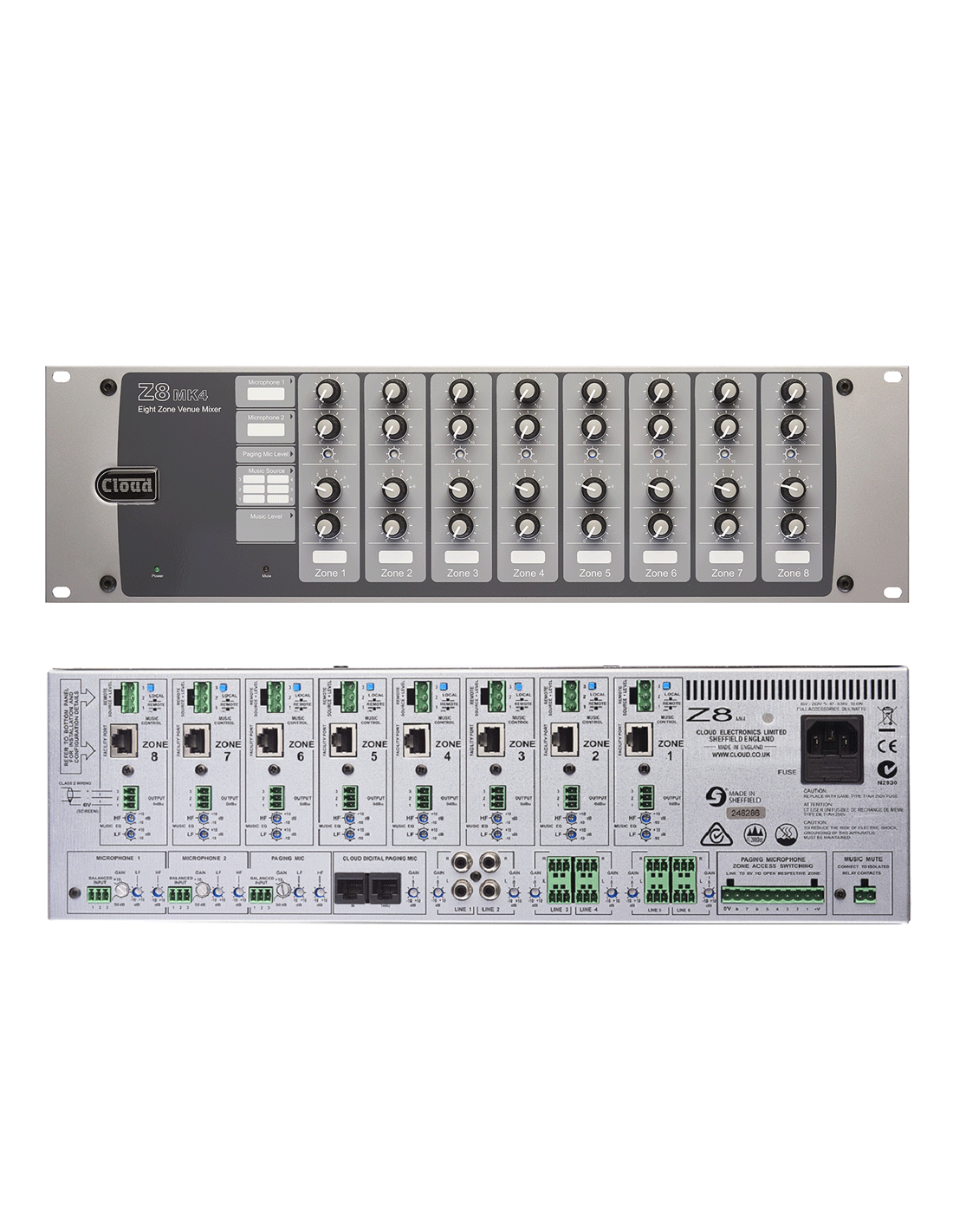 Les Cloud Z4MK4 et Z8MK4 sont des consoles de mixage audio multizones au format rack (3U). Elles permettent une gestion simplifiée de la musique d'ambiance et une diffusion audio polyvalente par microphone vers quatre ou huit zones distinctes. Elles conviennent à de nombreux types d'établissements, tels que pubs, bars, clubs, magasins, bureaux, hôtels, etc.
