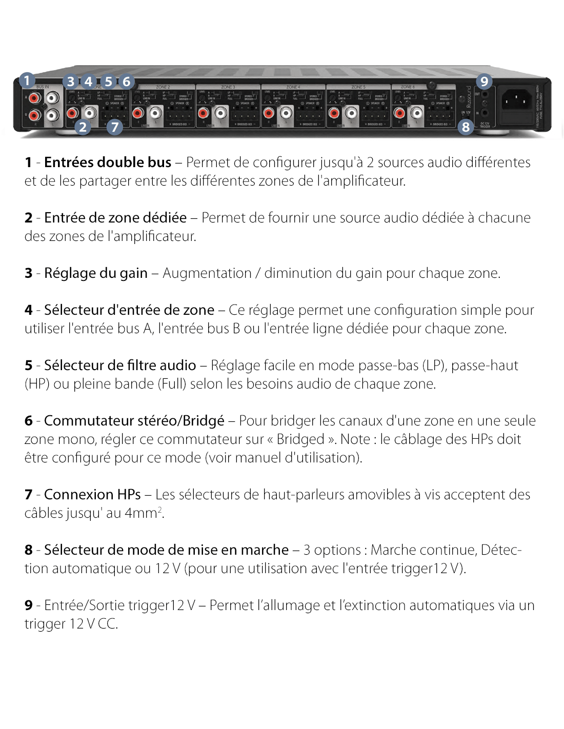 - Stable sous 2,66Ω, alimente jusqu'à 3 paires d'enceintes 8Ω / zone