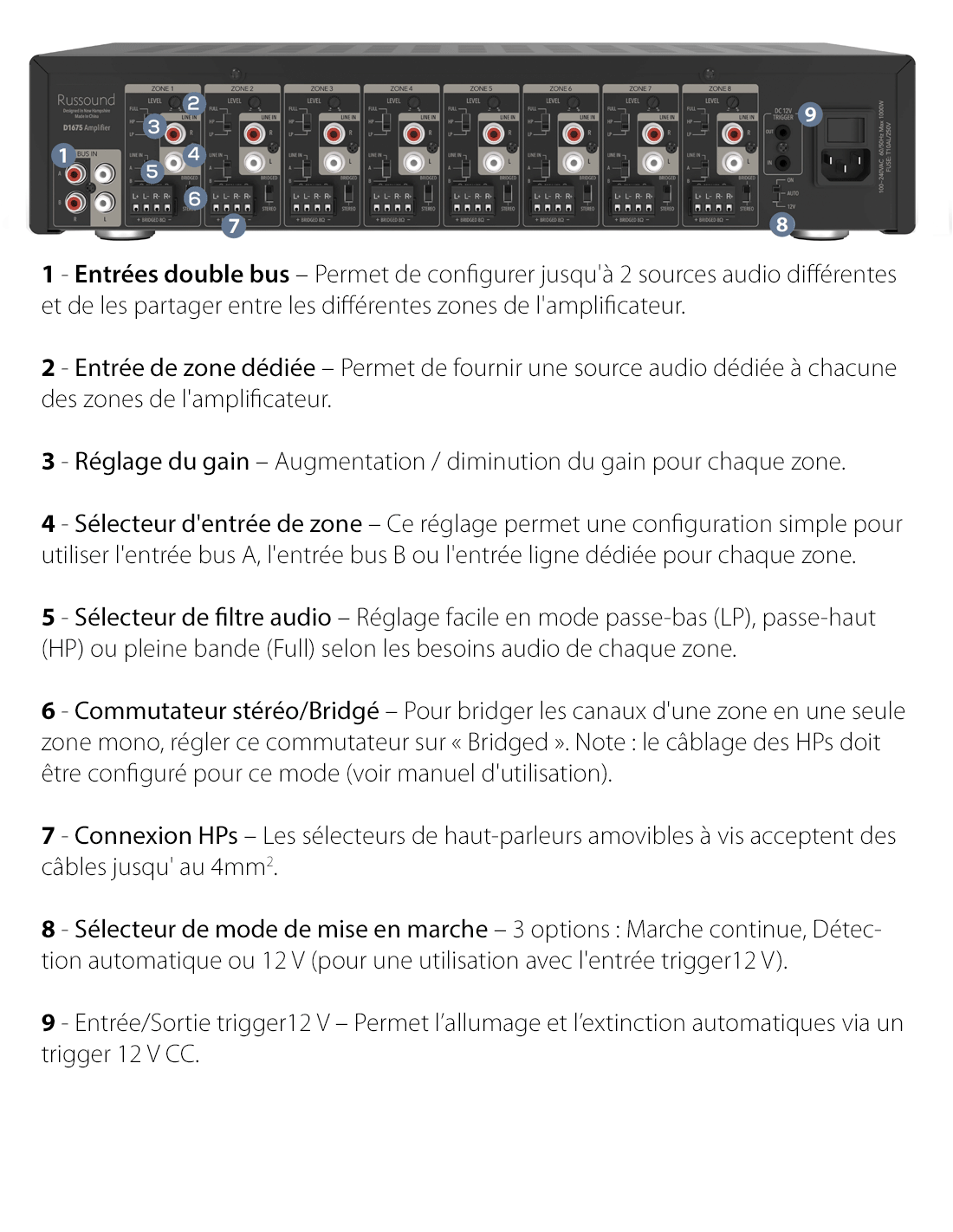- Stable sous 2,66Ω, alimente jusqu'à 3 paires d'enceintes 8Ω / zone