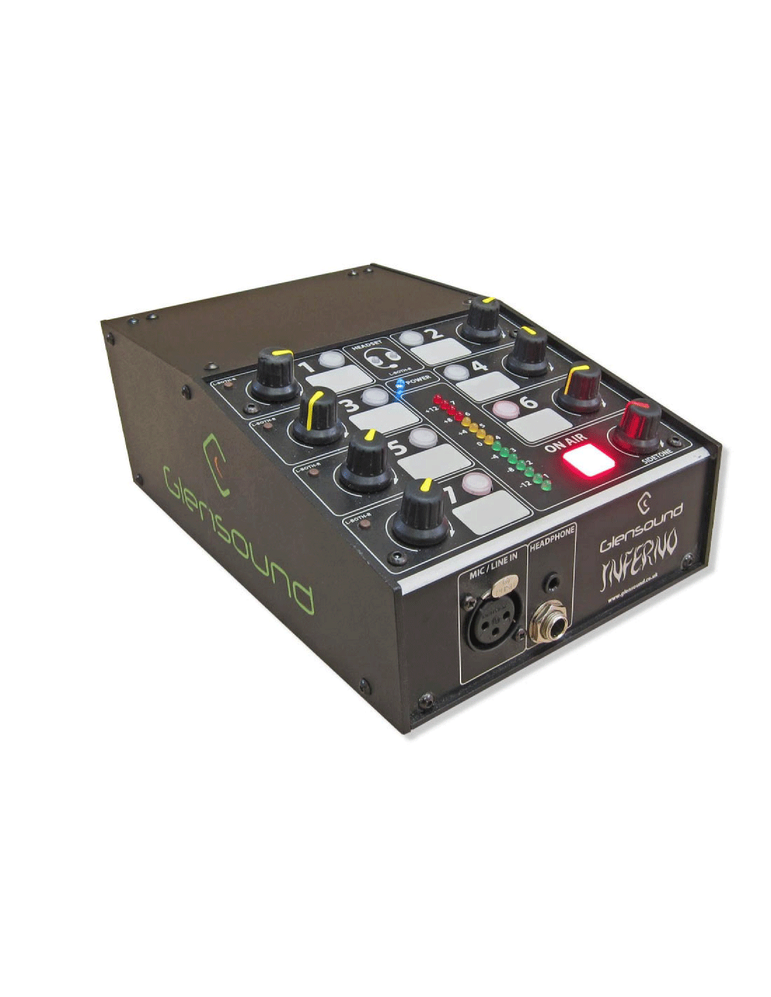 L'entrée unique est commutable sur le panneau arrière (ligne/micro/48v) et dispose d'un gain d'entrée réglable. L'entrée dispose également du système de limiteur de compresseur Referee de Glensound. Il applique un compresseur à taux variable aux pics d'entrée afin qu'aucun écrêtage ne se produise, sans affecter le reste du signal audio.