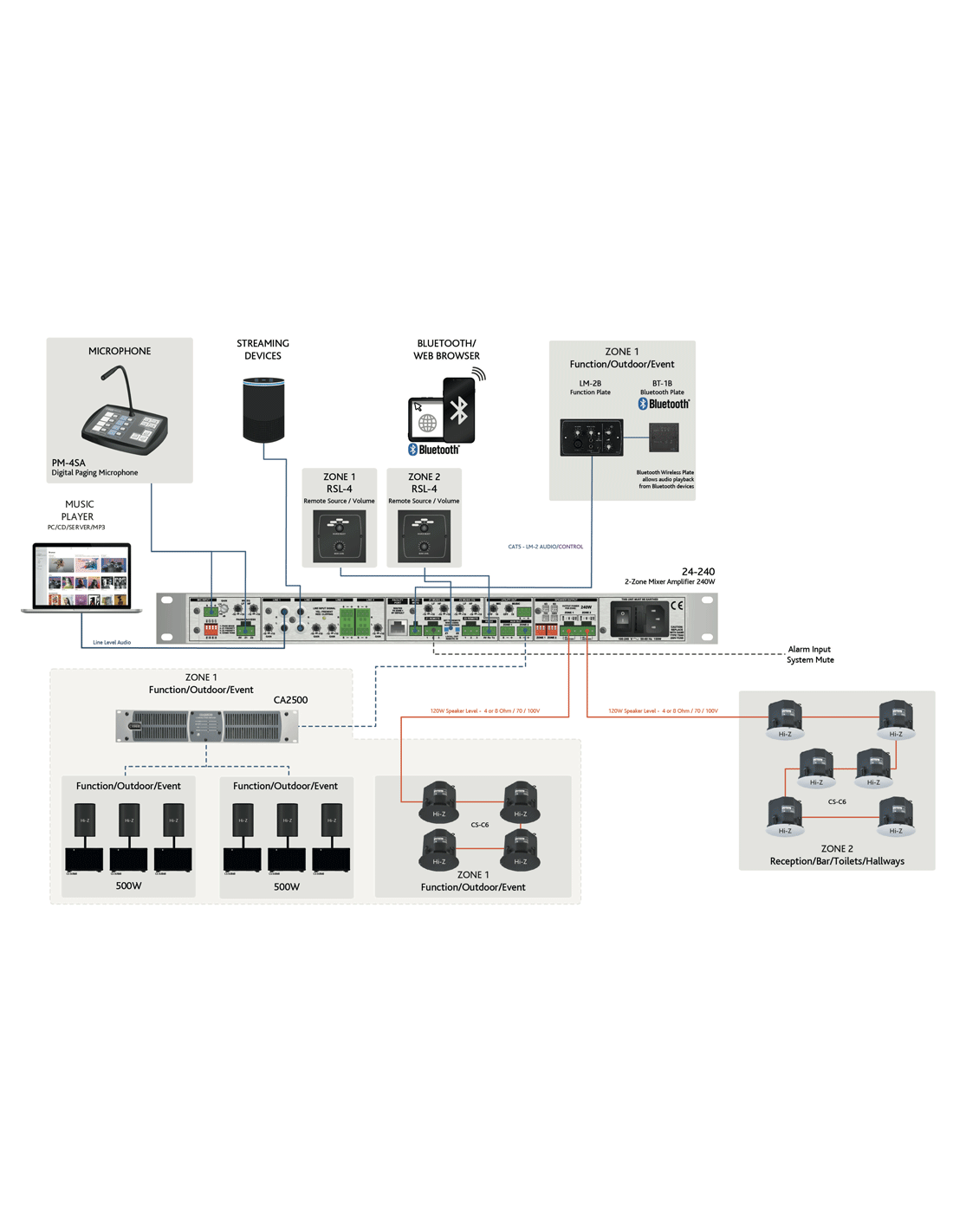 - 2 x 500W @ 70/100V (Hi-Z)
