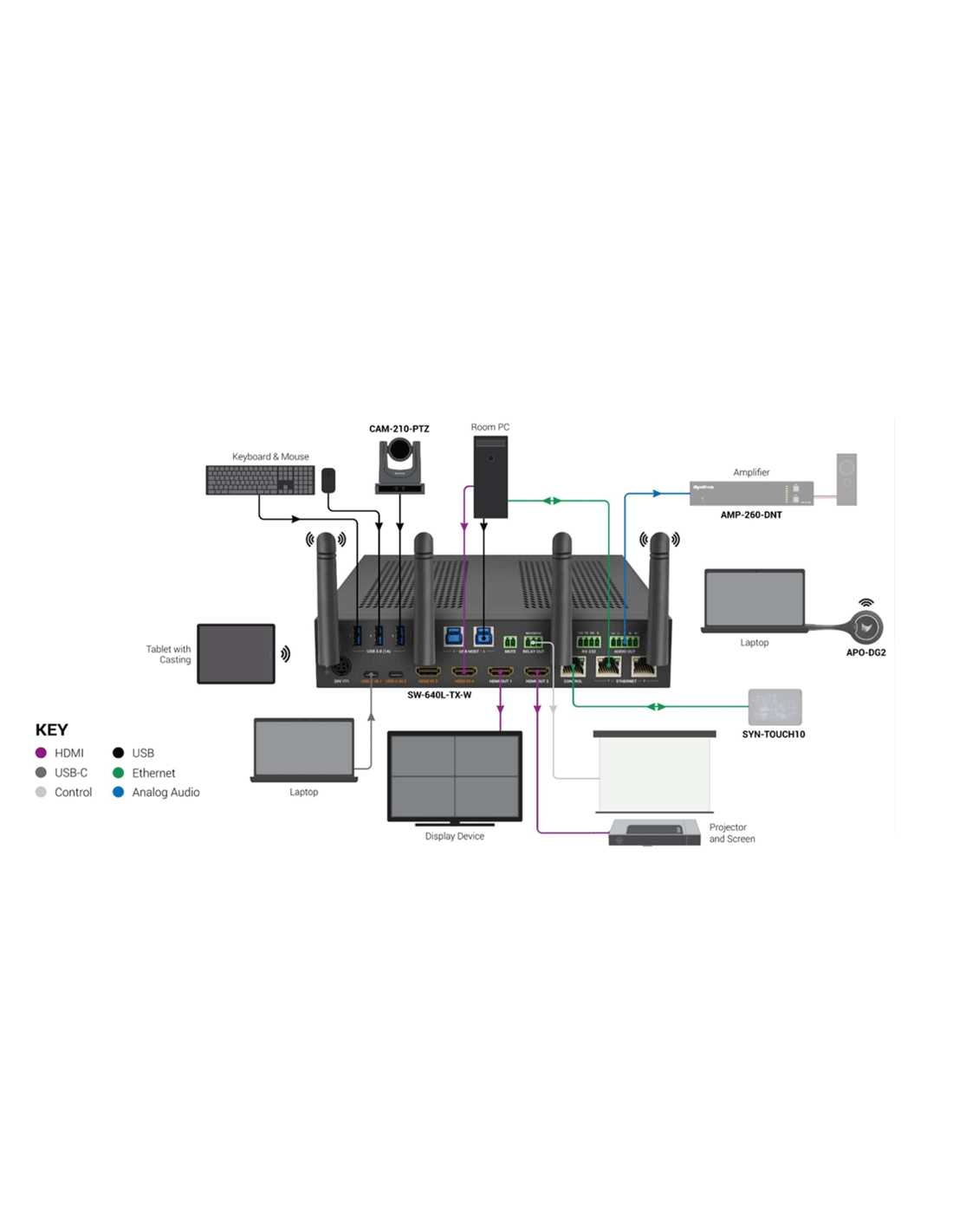 Le SW-640L-TX-W est un émetteur intégrant une switcher de présentation, conçu pour répondre aux exigences des salles de réunion et de conférence modernes. L'appareil offre deux entrés HDMI et deux entrées USB-C (avec un budget d'alimentation de 60W) et est compatible MST (Multi-Stream Transport) pour la réception de deux signaux vidéo.